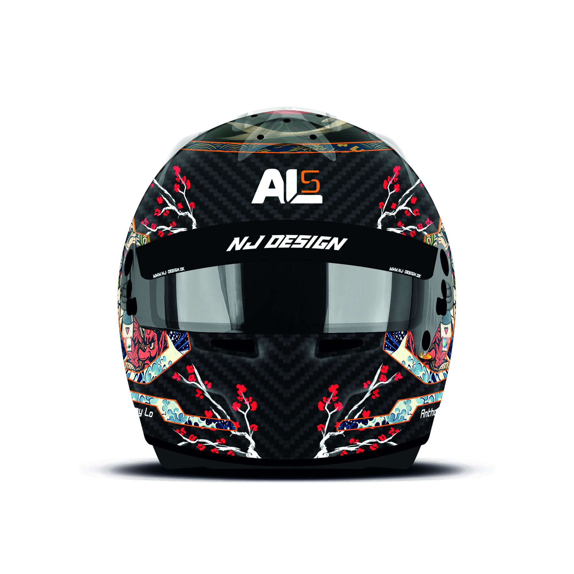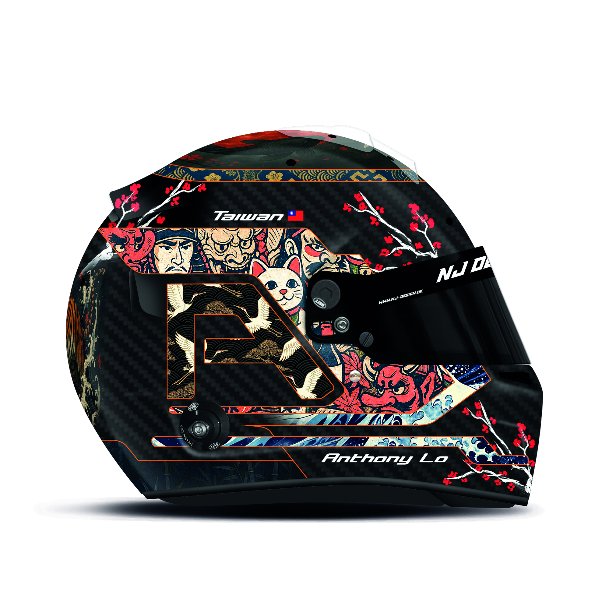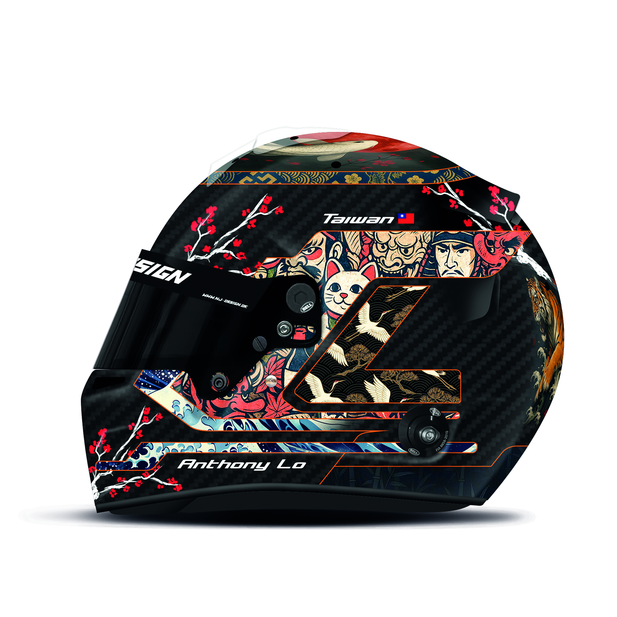 The custom helmet design is designed for Anthony Lo. The design is made on a Bell RS7 Carbon helmet with gloss finish. Below is a description of the helmet design.