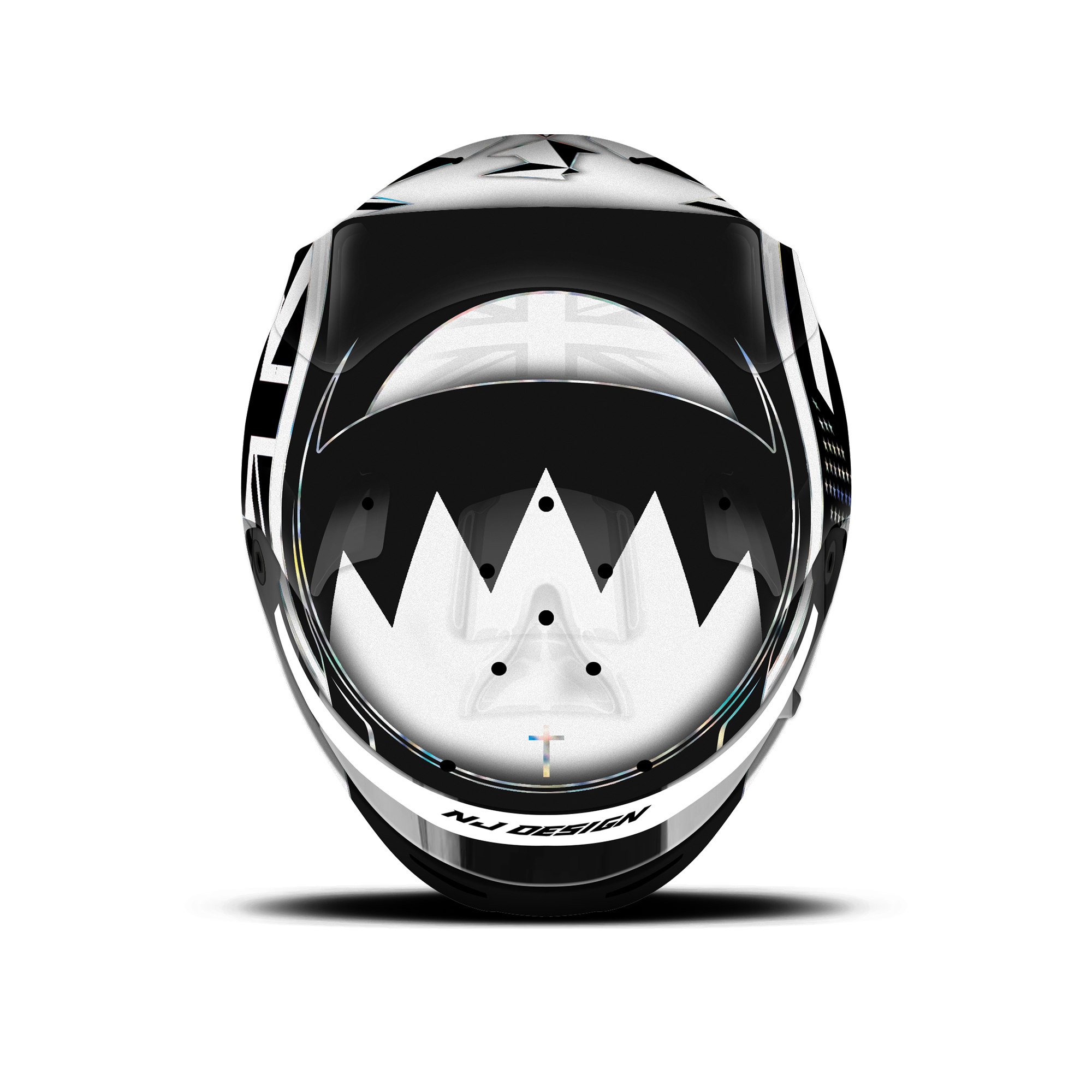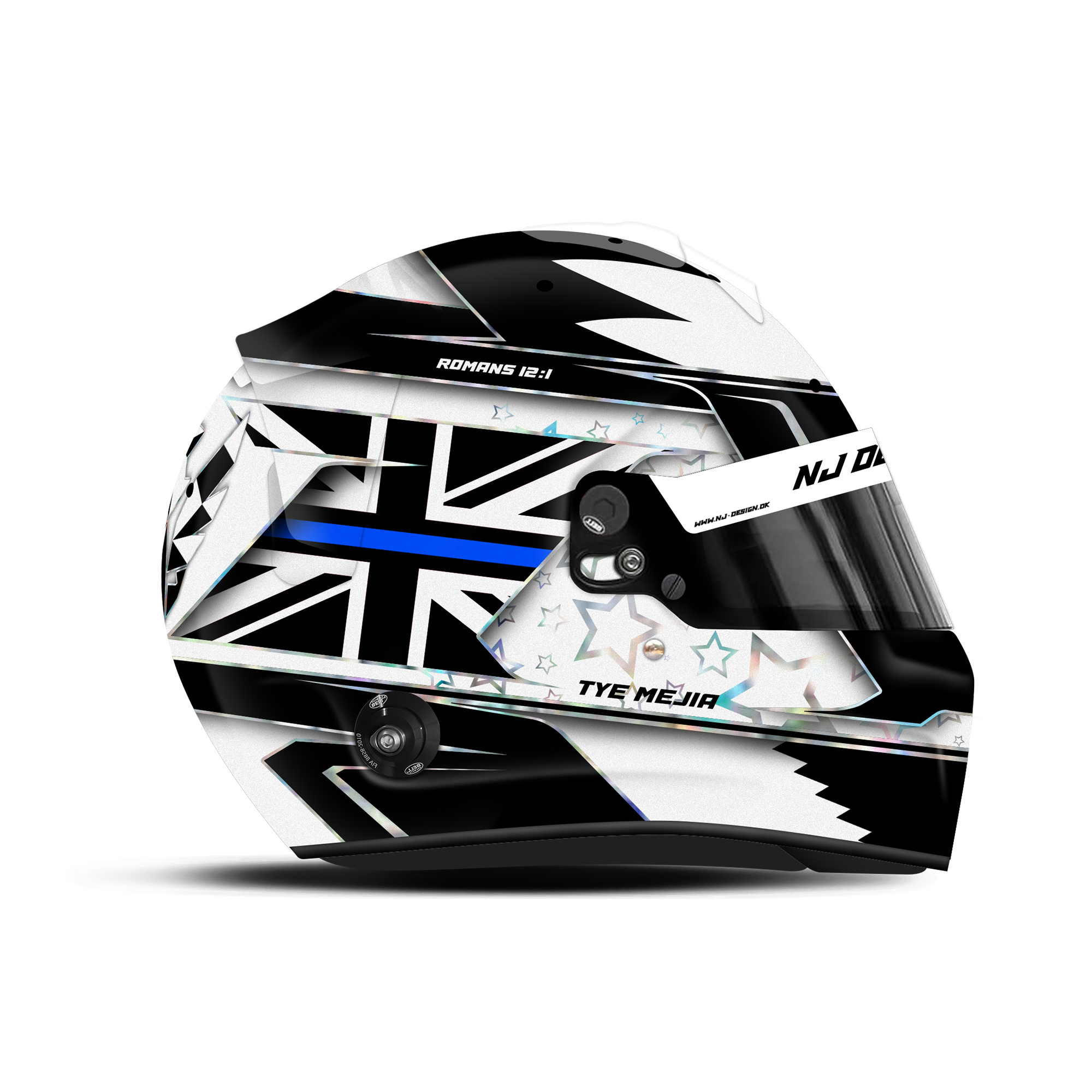 The custom helmet design is designed for Tye Majia. The design is made on a Bell Helmets RS7-K with gloss finish. Below is a description of the helmet design.