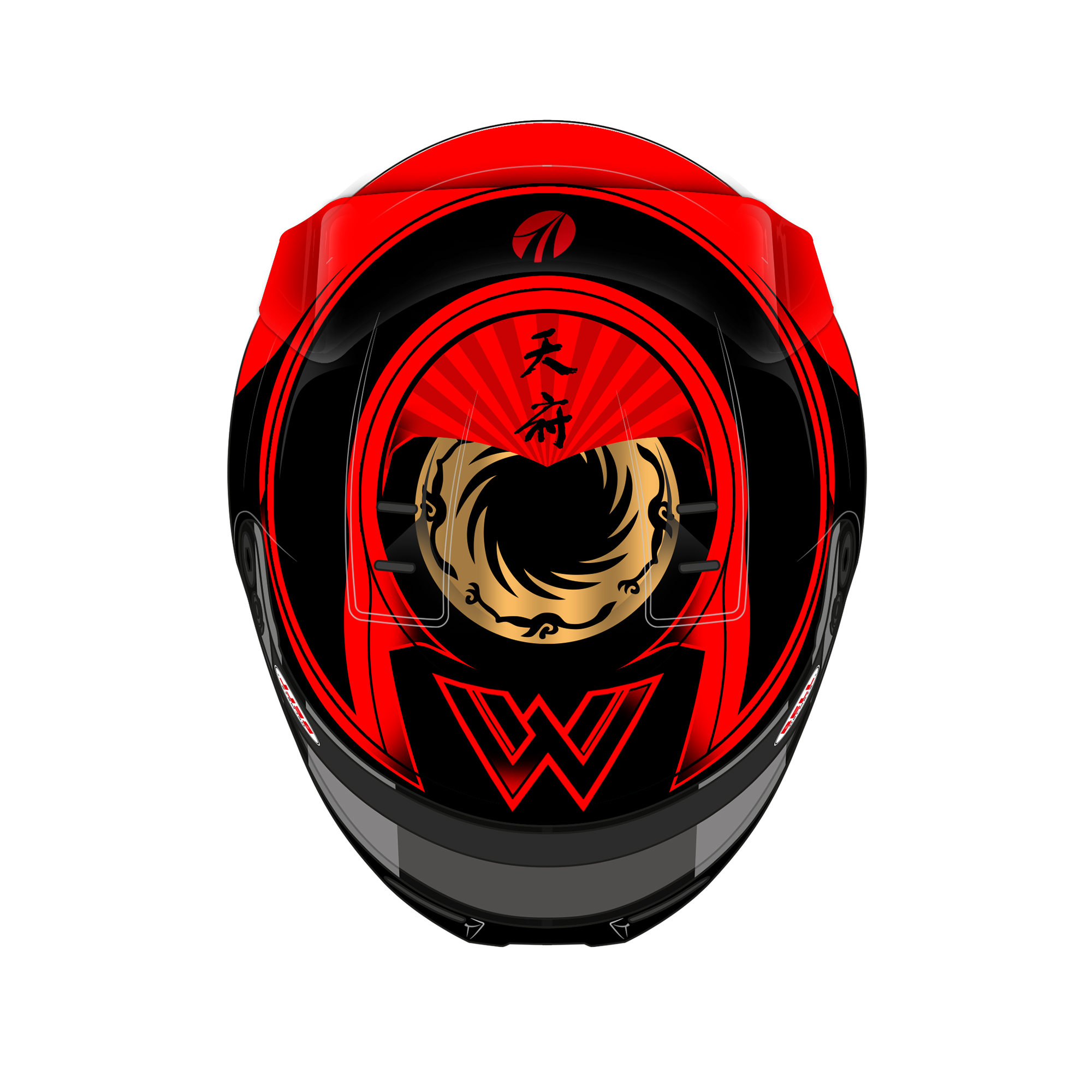 The custom helmet design is designed for Yufan Wang. The design is made on a Bell Helmets HP6 carbon with gloss finish. Below is a description of the helmet design.
